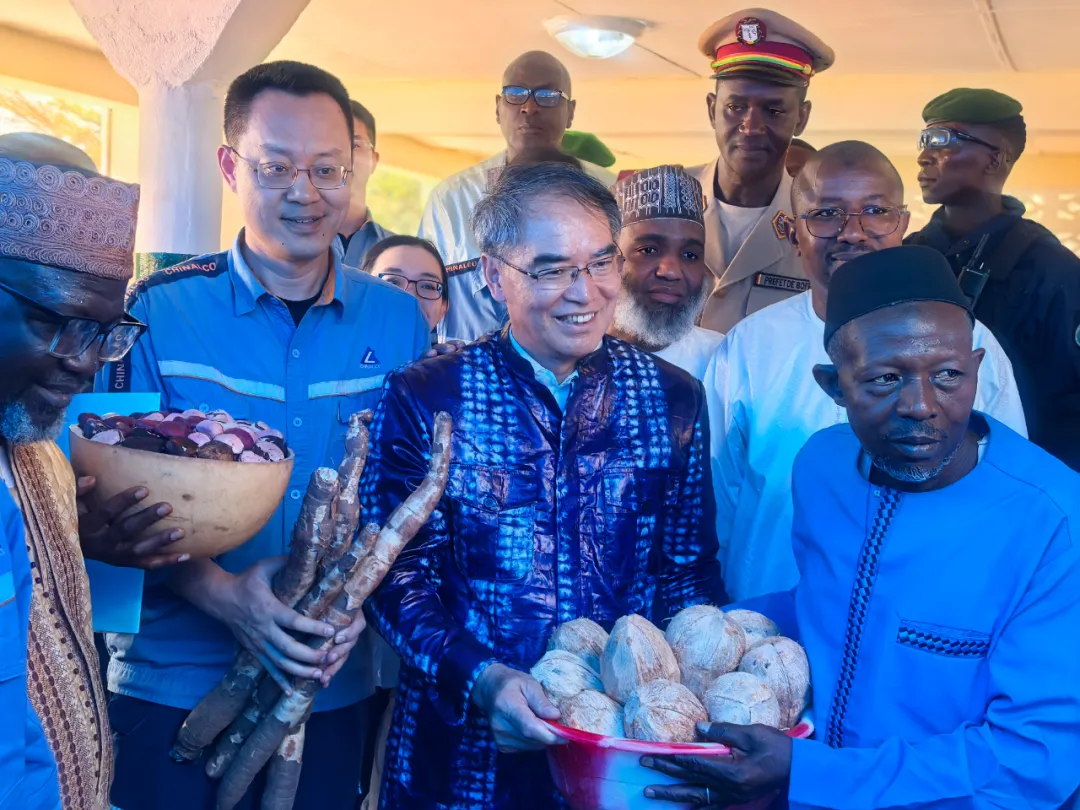 (典礼上,当地宗教长老与朝拜民众纷纷向中方人员赠送了椰子、木薯、可乐果、大米等)